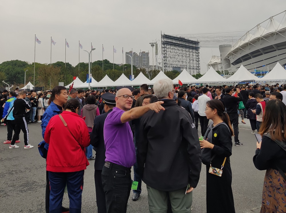 由于是武漢第一次舉辦規模最大的國際體育賽事,同事們都沒什么觀賽經驗,雖然我們提前了幾十分鐘到達比賽場館-武漢體育中心,但是還是敵不過人多,人從入口排到了馬路對面,只留了中間馬路供車輛六桶。我們排了接近四十分鐘的隊,雖然氣溫不高,但是我們依然是大汗淋漓,等到我們進場,比賽已經開始了一小會了。