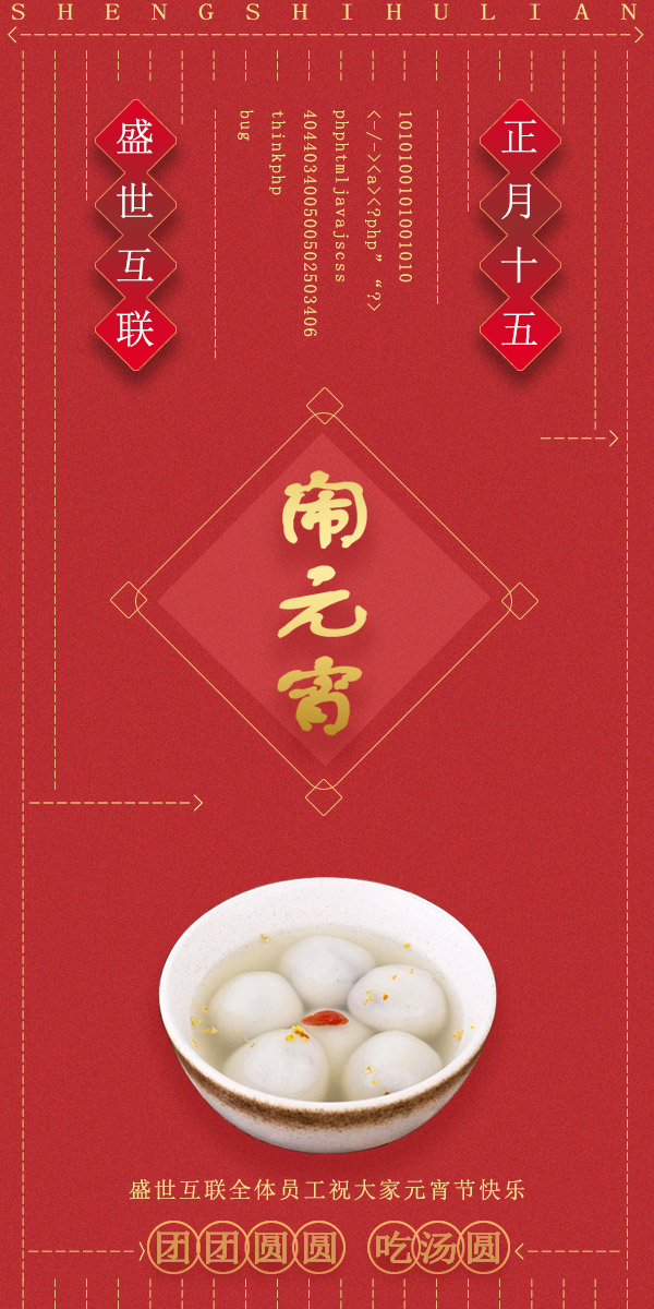 今天是正月十五,春節后的第一個節日元宵節!雖然元宵節不放假,但是我們對元宵節的熱情不會變淡,盛世互聯在此新春佳節之際祝大家身體健康、團團圓圓。